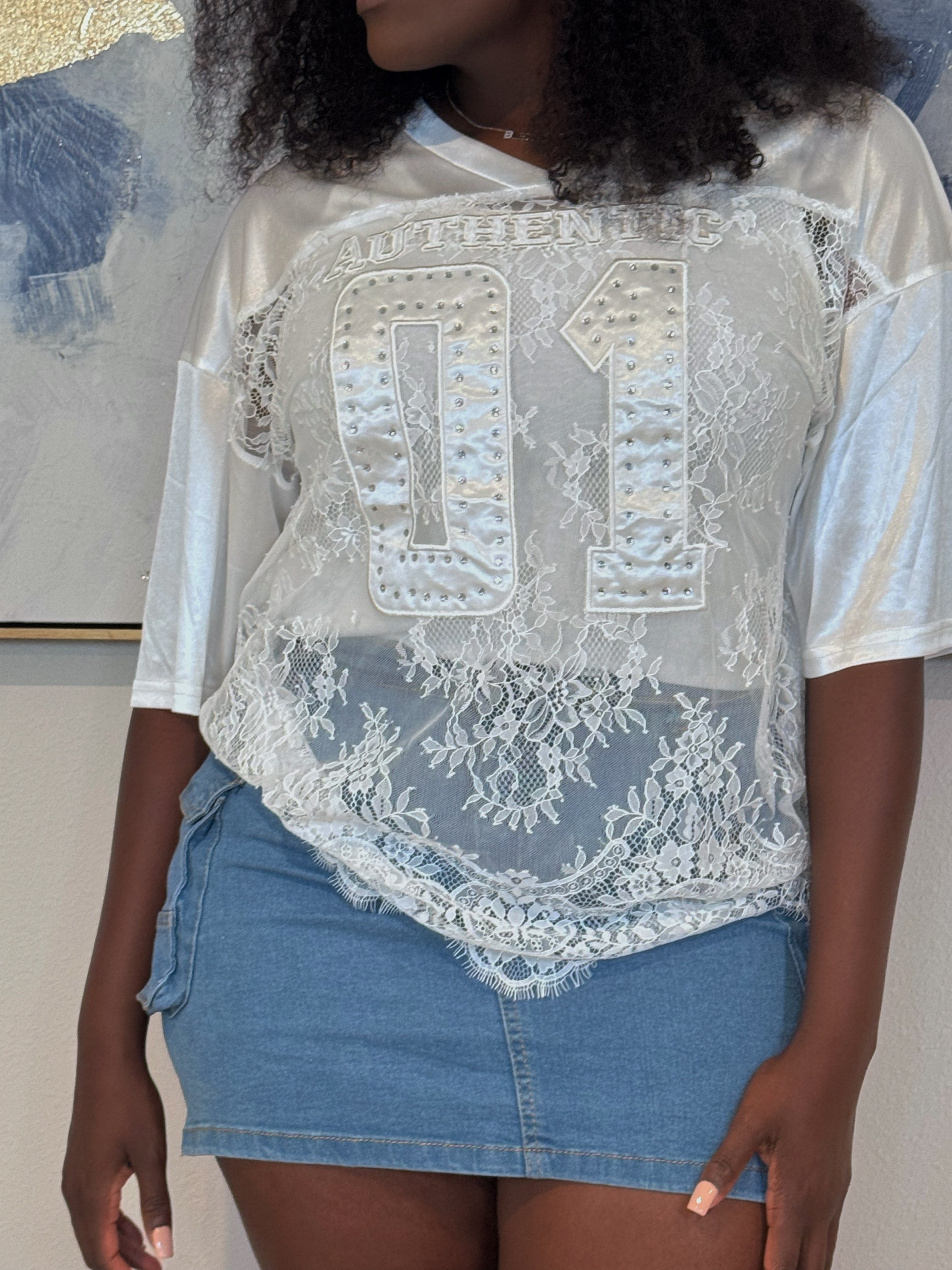 This patchwork rhinestone jersey top is where comfort and style collide. With bold letters, numbers, and rhinestone accents, it’s a statement piece that keeps casual days anything but basic.